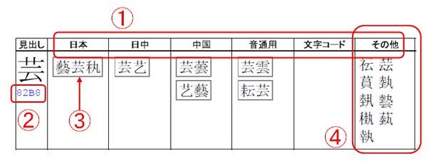 各関係表は,ISO/IEC 10646:2003のCJK統合漢字全20,902符号位置を見出し字として配列し,異体字をその右に列挙している。