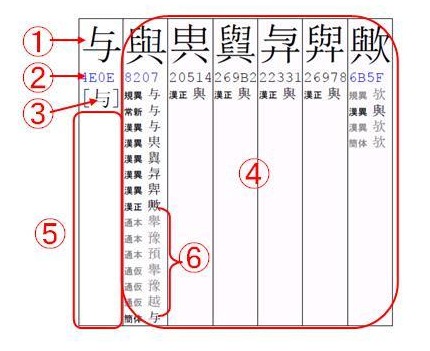各関係表見出し字の欄には,ISO/IEC 10646:2003の各符号位置のCTJKVによる5欄表記において,字形の差異が大きいものについては,それらをすべて併記した。差異の判断にはIPSJ-TS 0005:2002において区別されているかに拠った。